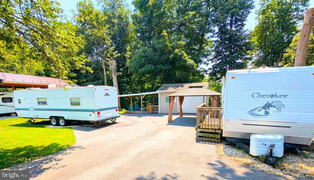 Check these great lots being sold together only. Has two campers as well as a gazabo, garage with and lean to off the side of the garage. Garage has a/c water with water heater to have hot water and electric. This lot backs to trees. Lots come with a 2007 Cherakee 38 ft camper travel trailer, washer, 2001 skyline 31 ft travel trailer that has a new frig and freezer. Lot comes with tv, table and chairs in garage. Don't miss out on these turnkey lots.